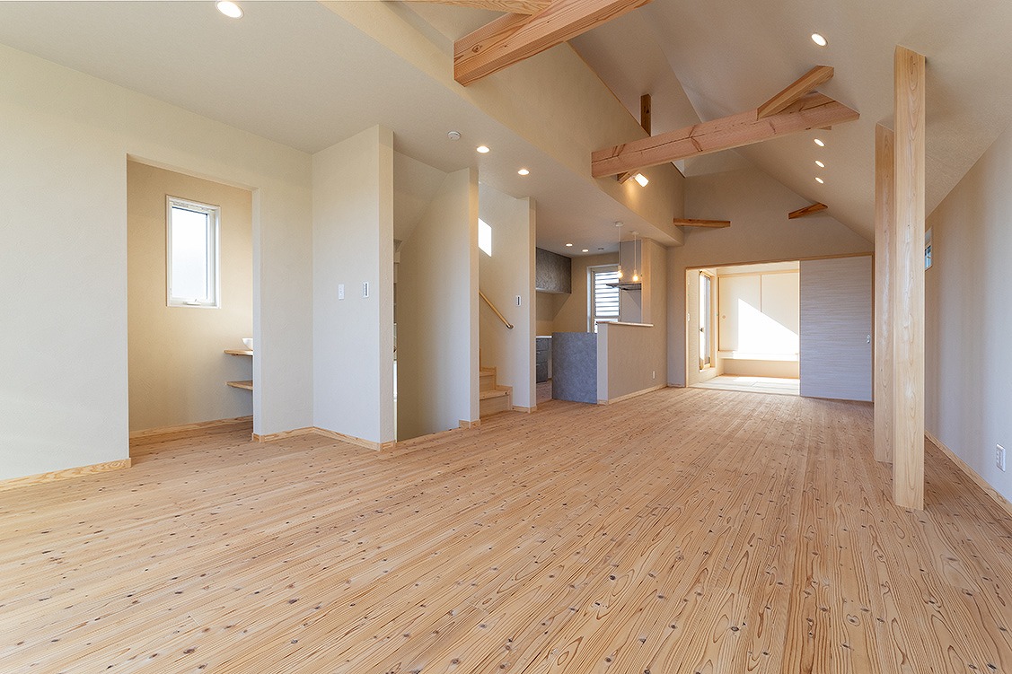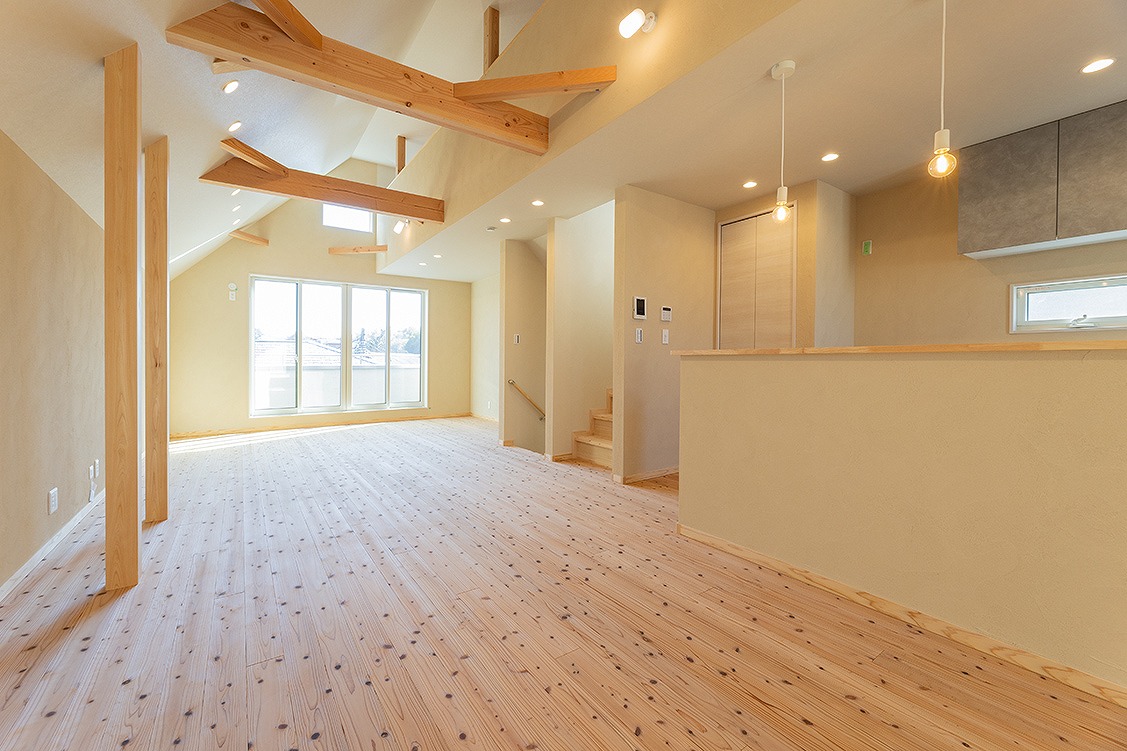 - 広々としたLDKと吹き抜け: 家族がゆったりと過ごせる広いLDKに、開放的な吹き抜け。
