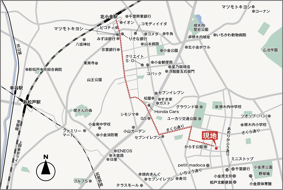 交通 | JR 常磐緩行線「北小金駅」徒歩26分 ※駅からバス停徒歩3分、乗車7分、バス停「御堂の上」から徒歩2分 |