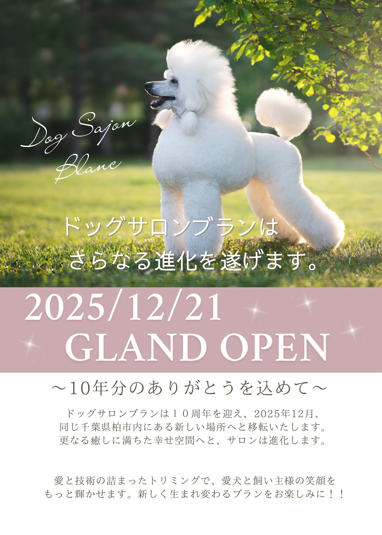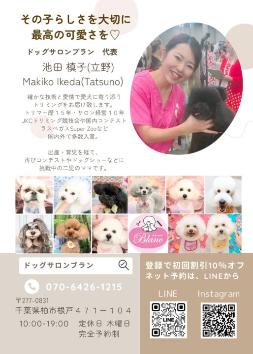 2025年12月19日 お知らせ 12月21日、お客様がトリミングサロンをオープン致します! 弊社にて新築を建てられたお客様が、このたび トリミングサロン をオープン致します! ドッグサロンブラン様は10周年を迎えられ、 本年、弊社にてサロン兼住居の建築をお手伝いさせて頂きました。 ワンちゃんのトリミングにはぜひ、ドッグサロンブラン様にお問合せください♪ 店舗は柏市根戸にございます。 >>Googleマップ ぜひ皆さま、ご予約・ご来店お待ちしております! \\ ドッグランもあります! // チラシの印刷はこちらをご利用ください >>PDF « 2/7(土)親子で楽しむ♪やさしい素材の手形アートイベント〈満員となりました〉 1/17(土)18(日)柏公園の家 完成見学会 »